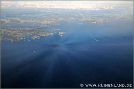 Seltsame Strahlen auf dem Wasser & Regenbogen-farbene Reflexionen über den Wolken