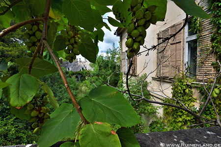 bereits ziemlich verwachsener Pfad auf das Gelände. Die Türen und Fenster
