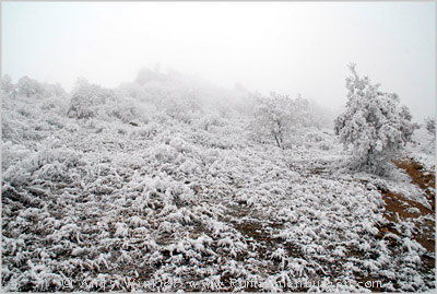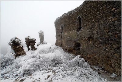 Im Anschluss suchte ich in Siria verzweifelt nach der gleichnamigen Burgruine, der dichte Hochnebel machte es jedoch unmöglich, auf den umliegenden Bergen irgendetwas zu erkennen. Zweimal fuhr ich auf gut Glück einen falschen Weg, bevor ich schließlich eine alte Frau und kurz darauf nochmals einen Mann fragte. Dieser schickte mich wild gestikulierend einen holprigen unbefestigten Weg mit tiefen Furchen "sus" (hoch / oben). "Jedes noch so kleine Kloster ist bereits zig Kilometer vorher ausgeschildert", dachte ich bei mir, "aber zu Burgen null Hinweise." *knurr* Bereits kurze Zeit später überlegte ich mir aufgrund des Straßenzustandes ernsthaft, ob ich weiterfahren sollte, die Fahrspuren im Schnee (und zugegeben auch meine Faulheit) verleiteten mich dann aber doch dazu. Rückblickend eine weise Entscheidung, denn zu Fuß hätte ich vom Dorf aus sicherlich eineinhalb Stunden benötigt und weiter oben wurde der Weg auch deutlich besser. Ich holperte also unsanft nach oben, wobei das Rumgeschaukel doch recht ungemütlich auf meine Blase drückte... Von der Ruine jedoch weit und breit keine Spur, da der Nebel nach wie vor alle Bergkuppen einhüllte. Nach einer halben Stunde stand ich bei immer tiefer werdendem Schnee mitten im Wald und war mir inzwischen sicher, viel zu weit zu sein.
