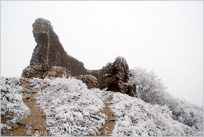Also wendete ich mit durchdrehenden Reifen in unzähligen Zügen, wobei ich schließlich im Schnee stecken blieb. Nachdem ich das Auto wieder heraus manövriert hatte, rollte wieder ein Stück bergab. Auf einem Plateau saß ein Hund im Schnee und ich folgte einem Weg, der meiner Vermutung nach zur Burg führen könnte. Und ich hatte den richtigen Riecher. Kurze Zeit später wurde der Pfad aus rotem Stein breiter, führte an schneebedeckten Bäumen vorbei und ich sah links über mir die milchige Silhouette der Ruine.