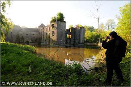 Nach knapp dreistündiger Fahrt mit Zwischenstopp zum Tanken in Luxemburg erreichten wir unser erstes Ziel: Chateau de Bormenville. Teile des Schlosses aus dem 19. Jahrhundert stehen in Ruinen, während angrenzende Gebäude nach wie vor privat bewohnt werden und dadurch leider jeden Zugang verhinderten. Um diese Gegebenheit wissend, war Bormenville lediglich als Zwischenstopp angedacht. Aber dennoch bot die sich bei leichtem Nebel im umlaufenden Wassergraben spiegelnde Schlossruine in der Morgensonne ein schönes Fotomotiv. Kühe, wie Perlen auf einer Kette aufgereiht, verfolgten uns derweil mit neugierigen Blicken.