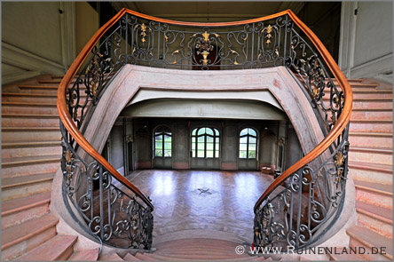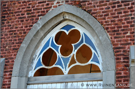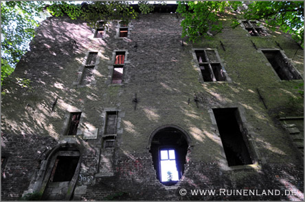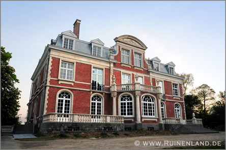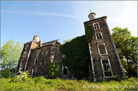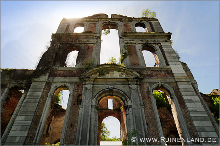 Mehr Glück hatten wir schließlich in Farciennes und der dortigen Schlossruine. Der dürftige Umfassungszaun war derart lückenhaft, dass der Zugang keinerlei Probleme darstellte und auch die ortsansässige Bevölkerung interessierte sich überhaupt nicht dafür, dass wir das Grundstück betraten. Doch so imposant die Mauern von außen noch wirkten, so ruinös waren sie im Inneren. Stark verfallene Reste von einst zweifelsfrei schmuckvollen Kaminen und Verzierungen waren noch zu erkennen, aber weiter als über das Erdgeschoss kamen wir leider nicht hinaus, da bedauerlicherweise nahezu alle Zwischendecken und Treppen längst eingestürzt waren.