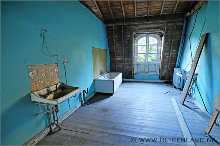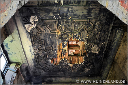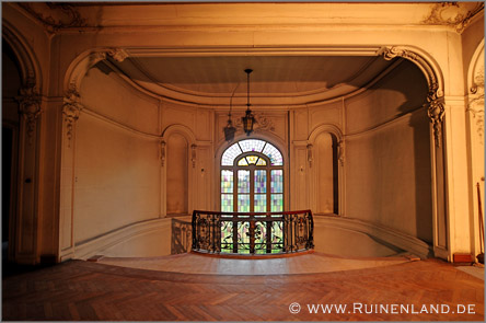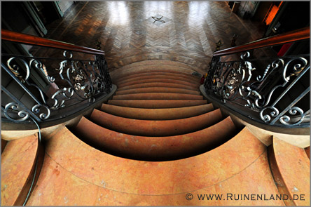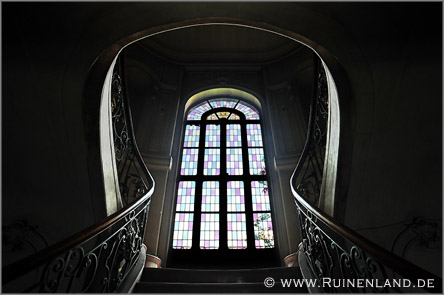 "Du Loup" ist mit gerade mal knapp einhundert Jahren ein vergleichsweise neues Schloss. Erbaut wurde es 1913, letztmalig bewohnt 2002 - so dachte ich zumindest... Davor stehend schaute ich es ungläubig an; ein Großteil der einst verschlossenen Rollos war geöffnet, neben dem Schloss standen zwei Autos und hinter einem der Fenster bewegte sich jemand. "Oh nein! Das darf doch nicht wahr sein! Nicht ausgerechnet dieses Schloss!" Tja, was nun? Ich wollte unbedingt dieses Treppenhaus mit dem hohen Bleiglasfenster fotografieren! Also das altbekannte Spiel: Ich klingelte und nach kurzer Zeit kam ein Mann ans Fenster. Miris Augen schienen in diesem Moment verzweifelt zu sagen "Da kommen wir auch nicht rein." Und im ersten Moment sah es auch danach aus, nachdem der Mann mir auf Englisch mitteilte, dass das Schloss nicht mehr leer stünde und für Touristen nicht zugänglich sei. Doch zur Abwechslung zumindest mal ein freundlicher Zeitgenosse. :-) Deshalb gab ich auch nicht so schnell auf und fragte ihn, ob es uns möglich sei, wenigstens das Treppenhaus fotografieren zu dürfen. Das Fenster schloss sich und wenig später erschien der Mann an der Tür. Er berichtete uns, dass er das Schloss, welches demnächst komplett saniert werden soll, vor kurzem bezogen hätte. Er kenne die Urbex-Szene aus dem Internet, aber verständlicherweise läge es nicht in seinem Interesse, dass weiterhin ständig Leute kommen und versuchen, in seine Wohnung einzudringen. Aus diesem Grund bat er mich bekannt zu machen, dass "du Loup" nicht länger verlassen sei - was ich auch direkt im Anschluss an meine Reise in diversen einschlägigen Foren publizierte. Und wir hatten Glück. Auch wenn das Schloss zukünftig nicht für Touristen zugänglich sei, gestattete er uns ausnahmsweise, zwei Räume, das Treppenhaus und das Dachgeschoss zu fotografieren. Lediglich könne er uns maximal eine halbe Stunde Zeit geben, da er dann weg müsse. Egal; wir waren happy und wollten dieses Angebot und die Zeit so gut es ging ausnutzen. Die folgenden 30 Minuten vergingen wie im Rausch. Selten habe ich mir so wenig Zeit für Details oder Einstellungen gelassen. Kamera aufs Stativ, durch die Räume gehetzt und abgedrückt, bis die Speicherkarte glühte. ;-) Aber dennoch sind ein paar brauchbare Aufnahmen dabei heraus gekommen und womöglich waren wir vorerst zwei der Letzten, die das Schloss betreten & innen fotografieren konnten / durften.