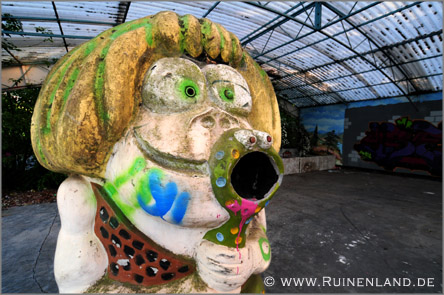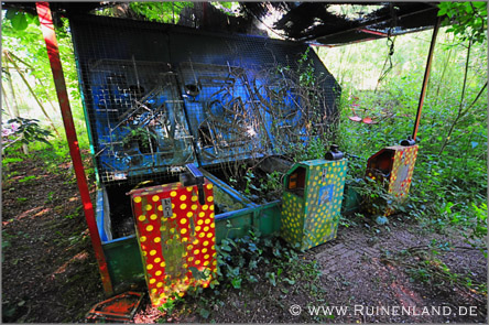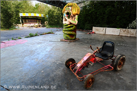 Weiter ging die Fahrt, auch wenn diese aufgrund unzähliger Baustellen und gesperrter Straßen reichlich nervig und uneingeplant zeitraubend war. Nach gefühltem fünfmaligem im-Kreis-Fahren erreichten wir jenen Freizeitpark, der in der Urbex-Szene und weit darüber hinaus schon seit Jahren bekannt ist. Deshalb wäre es auch unsinnig, den Namen zu verschweigen. Heute ist der "Dadipark" nur noch ein Schatten seiner selbst. Kein Vergleich mehr zu seinem ursprünglichen Aussehen und auch kein Vergleich mehr zu den Bildern, die dort noch vor vier, fünf Jahren entstanden. Quasi alles ist kaputt - teils aufgrund Abbau und Witterung sowie fehlender Nutzung & Wartung, vieles aber schlichtweg auch durch mutwillige Zerstörung. Dennoch finden sich auch heute noch ein paar nette Fotomotive.