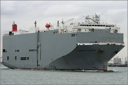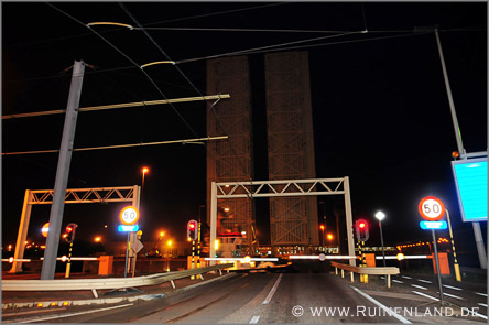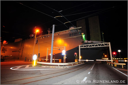 Auf der Weiterfahrt mussten wir an einer Zugbrücke warten. Ich stieg aus, um ein Foto zu machen und wollte gerade wieder einsteigen, als sich von links ein gigantisches Schiff ins Bild schob. Also schnell nochmals auf den Auslöser gedrückt! Wie ich im Internet nachlesen konnte, hat die "Shanghai Highway" eine Länge von 180 Metern, sie ist 32 m breit und fast 10 m hoch. Da sie auf der schnellen Nachtaufnahme ziemlich unspektakulär erscheint, zum Vergleich noch ein Tageslichtfoto aus dem Internet (aufgenommen von Jack Bouman).