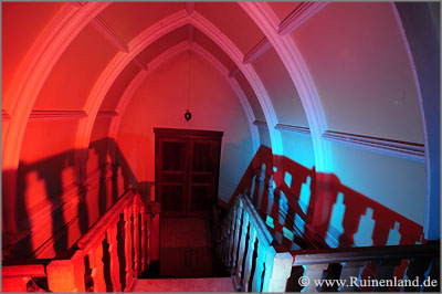 Ich versuchte meinen Ärger beiseite zu wischen und war schließlich auch froh, es zumindest ins Innere des Schlosses geschafft zu haben. Ärgerlicherweise ging Miri ausgerechnet hier das Stativ kaputt, noch bevor ich ein einziges Foto damit machen konnte. Nochmals den Berg runter und hoch, um meines aus dem Auto zu holen, kam nicht in Frage; das wäre zeitlich unklug gewesen und hätte zudem die Gefahr entdeckt zu werden erhöht. Ganz davon abgesehen hatte ich auch keine Lust auf doppelte Anstrengung. So blieb mir nur übrig, die ISO-Zahl meiner Kamera hochzuschrauben, um im Schloss ohne Stativ, aber auch ohne Blitz fotografieren zu können.