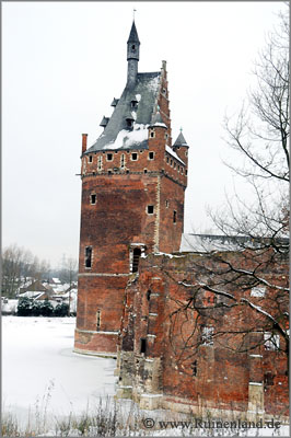 Der Tag war noch jung und durch die beiden bisherigen Misserfolge hatten wir noch weitaus mehr Zeit zur Verfügung, als ursprünglich gedacht. Aus diesem Grund machten wir einen kleinen Umweg und legten einen Stopp bei der Burg von Beersel ein. Auch sie war in den Wintermonaten nur an wenigen Tagen zugänglich, und wie bereits von mir vermutet heute verschlossen. So begnügten wir uns erneut mit wenigen Außenaufnahmen. Der Wassergraben der malerischen Burg, deren Geschichte bis ins 13. Jahrhundert zurück reicht, war zugefroren und die umliegenden Bäume standen in tiefem Schnee. Miri war indes wenig begeistert von den "vorteilhaften" Fotos, die ich von ihr aus kurzer Distanz per Weitwinkel-Objektiv anfertigte ;-)