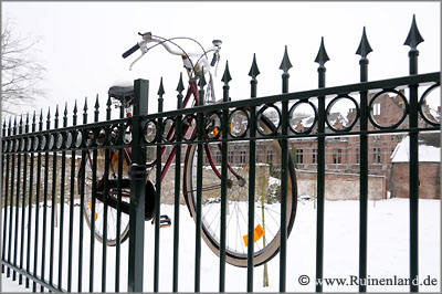 Um nicht restlos umsonst hier zu sein, schraubte ich meine Kamera aufs Stativ, schaltete den Selbstauslöser ein und hielt sie über die Mauer, um so wenigstens noch ein paar Außenaufnahmen erhaschen zu können. Unbefriedigend, aber mehr war hier heute leider nicht machbar. Da konnte auch das Motiv des an den Zaun gehängten Fahrrades keine bessere Stimmung hervorrufen.