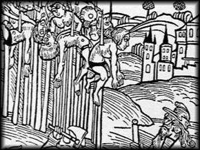 "... die Spieße von Holtz mit Unschlitt oder Talk ... man bindt solchen Übeltätern Sailer an die Füße, stößt ihnen den Spieß zu dem hinteren Leib hinein... Zuerst aber kniet der Delinquent mit in den Staub gedrücktem Haupte nieder, die angezogenen Oberschenkel gekreuzt; ... und die Bahn hinreichend eingefettet, der Pfahl, aber nicht angespitzt, sondern abgestumpft, ... die Organe beiseite schiebt, und wird fünfzig bis sechzig Zentimeter in den Mastdarm eingeführt, dann mit dem Delinquenten senkrecht aufgerichtet. Und der Körper mit seiner Schwere drückt Mann oder Weib hinab, und langsam dringt der Pfahl durch den Körper, sucht den tödlichen Weg."