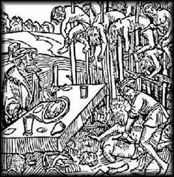 Als die Türken empfindliche Niederlagen in Rumänien hinnehmen mussten, sah Draculea erneut seine Chance, sein Erbe anzutreten. Er stellte siebenbürgische Kontingente auf und fiel mit ihnen in die Walachei ein. Vladislav II. verlor die entscheidende Schlacht und wurde hingerichtet. Der 25jährige Draculea bestieg als Vlad III. den Thron in Tirgoviste. Durch seine Reisen während des Exils hatte er eine fundierte Bildung auf den Gebieten der Kriegsstrategie und der Machtpolitik gewonnen. Um seine Macht weiter auszubauen, ernannte er sich selbst zum Vasall der Türken. Aber im eigenen Land regte sich bald auch Widerstand gegen ihn. Die Siebenbürger Sachsen, die ihm einst geholfen hatten Vladislav zu besiegen, stellten sich gegen ihn. Daraufhin fielen Draculea und seine Truppen brennend und mordend in die Städte seiner Gegner ein. Wer nicht in der Flammenhölle umkam, wurde am Wegesrand auf Pfähle gespießt. Dies war wohl die Geburtsstunde seines Beinamen "Tepes". Auch weitere Grausamkeiten verübte Vlad III. Draculea im eigenen Land. Einmal lud der Fürst seine Bojaren (Großbauern) zu einem Fest auf sein Schloss. Nach dem Festmahl fragte der Fürst seine Bojaren, unter wie vielen Fürsten sie schon gedient hätten. Einige konnten bis zu dreißig nennen. Er fragte weiter, warum einige nur so kurz regiert haben. Tepes gab die Antwort gleich selbst: Die raffgierigen Bojaren wollten nur Fürsten, die ausschließlich ihnen zusagten. Die Großbauern erschraken bei diesem Vorwurf und Totenstille trat ein. Dann begann die Leibgarde des Fürsten die Gäste zusammen zu treiben. Die Bojaren wurden zusammen mit ihren Frauen gepfählt, die Nachkommen zu Zwangsarbeit verurteilt. Zudem wurde das Land der Großbauern konfisziert. Eine andere Bevölkerungsgruppe, die ihm ein Dorn im Auge war, ließ er ebenfalls zu einem Festmahl einladen. Nachdem sie ausgiebig gespeist hatten, fragte der Fürst sie, ob er sie von allen ihren Sorgen befreien solle. Als sie dies bejahten, ließ er die Türen verriegeln und den ganzen Saal niederbrennen. Niemand überlebte. Die menschenverachtende Logik eines grausamen Herrschers - Die Armut abschaffen, indem man die Armen abschafft.