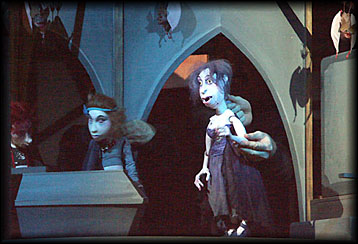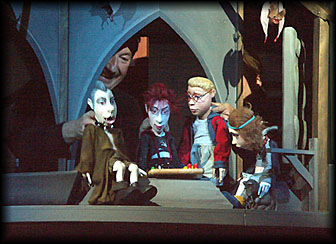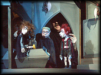 Ich habe das Stück im September in Worms gesehen. Es war mal eine ganz andere Darstellung vom kleinen Vampir, bisher gab noch keine Umsetzung mit Puppen. Die "Bühne" und die Puppen waren mit sehr viel Liebe zu Detail in Handarbeit gestaltet (bewegliche Münder, aufklappbare Sargdeckel...). Das etwa 3 Meter große Bühnenhaus konnte gedreht werden, so dass dort 4 verschiedene Bühnenbilder untergebracht werden konnten: Die Wohnung der Bohnsacks, Antons Zimmer, der Friedhof und die Schlotterstein-Gruft. Die Handlung und die Dialoge wurden ganz nah an das Buch angelehnt, was mir ebenfalls sehr gut gefallen hat. Es war Herrn Sperlich wichtig, wie er mir sagte, keine derart von den Büchern abweichende Handlung zu inszenieren, wie zum Beispiel beim Kinofilm. Antons Eltern wurden von Frau & Herrn Sperlich selbst mitgespielt (sie hatten in diesen Spielmomenten Halbmasken auf).
