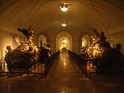 Die Kaisergruft, bzw. Kapuzinergruft (Tegetthoffstr. 2, Haltestelle „Karlsplatz / Oper“ oder „Albertinaplatz“, 4 Euro) wartet mit einer morbiden Schönheit auf, die an Prunk jede andere Gruft in Wien übertrifft. Kaiserin Anna, die Gemahlin von Kaiser Matthias, gab 1618 den Bau der Grabstätte in Auftrag, für den sie dem Orden der Kapuziner (daher auch Kapuzinergruft genannt) eine Kirche und ein Kloster stiftete. Das Kaiserpaar wurde 1633 als erstes in der Familiengruft der Habsburger beigesetzt; 146 Adelige, davon 12 Kaiser sowie 19 Kaiserinnen und Königinnen, haben seit dem dort ihre letzte Ruhestätte gefunden. Am beeindruckendsten ist der prachtvolle spätbarocke Doppelsarg von Maria Theresia und ihrem Gemahl, Kaiser Franz I. Stephan von Lothringen, der kaum mehr an einen Sarg, sondern eher an ein kunstvoll verziertes und mit Statuen besetztes Monument erinnert. Der letzte hier bestattete Kaiser war 1916 Franz Joseph I., die letzte Beisetzung in der Gruft 1989. Um die Zinnsärge vor Verfall zu retten, wurden seit den 50ern bis heute aufwendige Restaurierungsarbeiten unternommen. 1960 wurde die Gruft in einem Bereich unterhalb des Klostergartens erheblich erweitert.