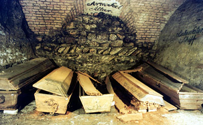 Von etwa 1630 bis 1784 sind laut Totenprotokoll 4000 Verstorbene in den insgesamt 25 Grüften (von denen 19 heute noch zugänglich sind) beerdigt worden. Da es jedoch nur noch 211 Holz-, 33 Metall-, und zwei ummauerte Särge gibt, stellt sich die Frage, wohin die vielen Toten verschwunden sind. Das Rätsel löste sich 1951 bei Grabungen im Mittelschiff, bei der man im Boden auf zwei Schichten Knochen und Kleidung stieß, die lediglich durch eine dünne aufgeschüttete Lehmschicht von einander getrennt waren. So weisen nur einige Familiengrüfte noch den originalen Ziegelboden auf, in den anderen Gewölben wandelt der Besucher buchstäblich auf den Überresten von Verstorbenen.