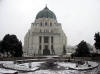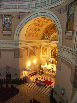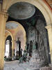 Es begann bereits zu dämmern, als ich meinen Weg in Richtung der alles überragenden Friedhofskirche fortsetzte. Die mächtige, fast 60m hohe Kirche zum heiligen Borromäus mit einer überdimensionalen Kuppel wurde nach vierjähriger Bauzeit im Jahr 1911 fertig gestellt. Durch einen der Ecktürme der Vorderfassade gelangte ich in die Unterkirche mit 40 Bodengrüften, welche durch ihre Bauart jedoch eher an ein Theaterfoyer, als an eine Gruft erinnerte. In der gewaltigen Oberkirche, die in den 50ern nach Zerstörungen im zweiten Weltkrieg komplett restauriert wurde, hat man ohne Zwischenstockwerk einen freien Blick bis auf die bemalte Kuppel sowie von deren Empore auf Altar und Orgel.