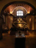 Wohl nur wenige würden es beim Schreiten auf den Bodenplatten des Stephansdomes vermuten, dass sich unter ihren Füssen eine Welt der Toten befindet. Im linken Seitenschiff befindet sich der Eingang in diese düstere Unterwelt (nur mit Führungen zu besichtigen, 4 Euro). Als ich auf die nächste Führung wartete, füllte sich der Treffpunkt zu meinem Missfallen immer mehr, was letztendlich dazu führte, dass rund 35 Personen am Rundgang durch die engen Katakomben teilnahmen. Wie sich wohl jeder vorstellen kann, ließ diese Menschenmasse in den verzweigten feuchten Gängen kaum die entsprechende Stimmung von Tod und Vergänglichkeit aufkommen. Aber auch sonst hätte sich dieses Empfinden bei mir wohl nur an den wenigsten Stellen entwickelt. Denn nach dem Abstieg gelangte man zwar zuerst in den ältesten Teil der Katakomben; dieser wurde jedoch komplett renoviert und im Rahmen dessen mit weißem Verputz und Neonlampen versehen. In keinem Fall etwas, was ich mit dem Begriff „Katakomben“ verbinden würde. Nach dem Durchschreiten einer unterirdischen Kapelle kamen wir in eine Gruft, in der sich mehrere verschlossene Kupfersärge mit den Leichnahmen von Bischöfen und Kupfergefäße befanden. Die Metallgefäße, die teils mit Kreuzen und Totenschädeln verziert waren, enthielten die Eingeweide der Habsburger (es war in Wien Brauch, die Körper der Verstorbenen zu leeren und die Innereien eingelegt in Alkohol separat zu bestatten. Die Körper der Habsburger wurden in der Kaisergruft beigesetzt). Nach einem kurzen Stopp in jener (ebenfalls neu renovierten) Gruft, in welcher die Domherren und Bischöfe hinter roten Marmorplatten bestattet sind, begaben wir uns in den zwar später erbauten, jedoch in meinen Augen weitaus interessanteren Teil der Katakomben: dunkle Gänge mit modriger Luft führten weiter ins Erdinnere bis in einen hoch gewölbten Raum, in welchem sich ein vergittertes Fenster befand. Dahinter standen verfallene Särge und aufgeschichtete Knochen, stark zerfallene Schädel starrten mich fratzengleich an. Hier löste ich mich von der Führungs-Gruppe und trottete ihr nur langsam hinterher, um zumindest den weitaus düstereren Teil der Katakomben in Ruhe anschauen zu können. Es folgten weitere Räume, die bis obenhin mit menschlichen Gebeinen angefüllt waren – ein Resultat aus vergangenen „Aufräumarbeiten“.