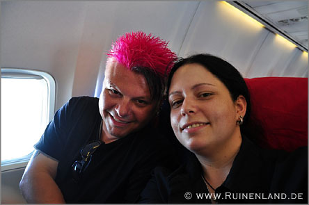 Im Flieger saß eine Frau neben uns, die fünf oder sechs Kinder dabei hatte. Kaum hatten wir abgehoben, setzte sich die Frau (die noch immer lautstark per Handy telefonierte) plötzlich jedoch ganz woanders hin und beschäftigte sich ausgiebig mit ihrem Schminkritual, während ihre "wohlerzogene" Kinder buchstäblich über die Sitze sprangen. Der Lärmpegel ging dadurch derart nach oben, dass es nicht lange dauerte, bis sich andere Fluggäste darüber beschwerten. Dennoch musste die Flugbegleitung die Mutter mehrmals bitten, sich um ihre Kinder zu kümmern, bis diese der Aufforderung endlich mal nachkam. Sie war jedoch offensichtlich weiterhin mehr an ihrem Make up interessiert, ließ die Kids weiter schreiend durch den Flieger toben und trug mittlerweile die vierte Schicht Mascara auf. Ihre Wimpern bestanden schon jetzt nur noch aus dicken, verklebten schwarzen Klumpen. Erneut wies die Flugbegleitung sie zurecht, was jedoch lediglich dazu führte, dass sie ihre Kinder lustlos ermahnte, um anschließend die dritte Schicht Rouge aufzutragen. Optisch machte sie inzwischen einer Straßendirne aus der Rokoko-Zeit alle Ehre... Miri und ich konnten es uns indes nicht verkneifen, die Frau nachzuäffen, was sie sichtlich weniger amüsant fand, als wir. :-D
