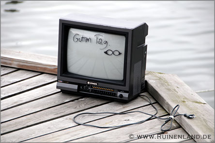 Um 17.30 Uhr landeten wir in Göteborg, wo uns Susanne schon erwartete. Auf dem Weg zu unserer Herberge winkten mir durch ein Schaufenster zwei Frisörinnen wild fuchtelnd zu, die offensichtlich ganz angetan von meiner Haarfarbe waren. :-) Kaum waren die Taschen im Zimmer verstaut, fuhren wir zum Hafen, um heute noch etwas zu sehen. Witzigerweise stand dort am Pier ein kleiner ausrangierter Fernseher, auf den jemand mit schwarzem Edding in Deutsch "Guten Tag" geschrieben hatte.