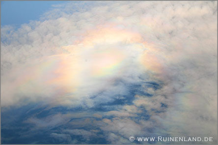 Seltsame Strahlen auf dem Wasser & Regenbogen-farbene Reflexionen über den Wolken