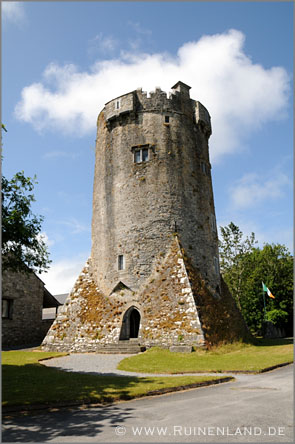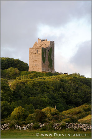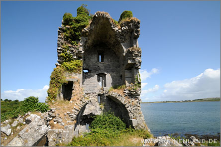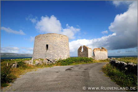 So schnell, wie Regen und Wolken gekommen waren, verschwanden sie auch wieder, während wir über Finavarra zur Küste fuhren. Die Wellen brachen sich rauschend an den Steinen, vor der sich der wuchtige Martello Tower erhob (einer von insgesamt 164 kleinen Befestigungen, die das britische Empire zwischen 1804 und 1814 zur Zeit der Napoleonischen Kriege errichtete). Zwar führte ein geknotetes Seil zum hochgelegenen Eingang des Turmes, ich verzichtete aber darauf, mich dort hoch zu quälen. Auf dem Rückweg zur Hauptstraße legten wir noch einen Fotostopp an den Ruinen von Finvarra Manor ein. 1768 als prunkvolles Haus von William Skirrett erbaut, stehen sie heute auf Privatgrund und können wegen Einsturzgefahr nicht besichtigt werden.