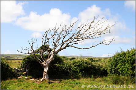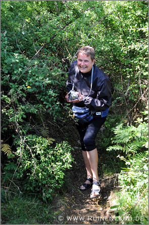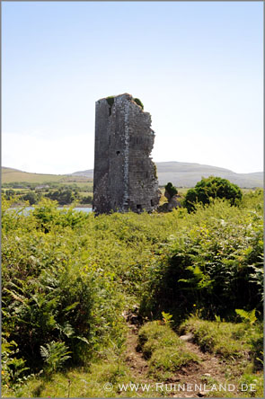 Der Zugang zur nächsten Ruine, dem im 15. Jahrhundert erbauten Bealaclugga Castle, war indes komplizierter. In einer kleinen Bucht gelegen, führen keine Wege (bzw. bestenfalls Trampelpfade) zu ihr, so dass Birgit und ich uns durch fieses Dornengestrüpp kämpfen mussten, um sie überhaupt zu erreichen. Zu allem Überfluss lag in den Büschen auch noch eine tote Kuh, von der jedoch nur noch Haut und Knochen übrig waren. Für den Rückweg wählten wir deshalb einen etwas weiteren Weg, in der Hoffnung, dass dieser einfacher sei. Dort verfolgten uns schließlich jedoch "vermeintlich Fleisch fressende Killerkühe" und zum Schluss mussten wir auch noch eine äußerst brüchige, mit Dornenranken bewachsene Mauer überklettern.