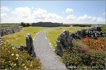 Während Birgit im Auto wartete, besichtigte ich anschließend noch das Caherconnel Stone Fort, verbunden mit einer interessanten Audioführung samt Film über die Ringfestungen der Burren. Mit gut 40 m Durchmessern haben die einst sechs Meter hohen und bis zu vier Meter dicken Wände heute noch eine Resthöhe von drei Metern. Ursprünglich diente Caherconnell vermutlich einer wohlhabenden Familie dazu, ihr Vieh bei feindlichen Einfällen zu schützen, wurde später als Befestigung aber mindestens bis ins 15. Jahrhundert hinein genutzt. Radiokarbon-Untersuchungen belegten sogar menschliche Überreste von 1560-1630. Bei archäologischen Untersuchungen fand man 30 m südöstlich des Forts zudem eine Kammer mit Werkzeugen und Keramiken aus der mittleren Bronzezeit (2000-1500 v.Chr.).