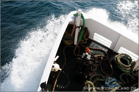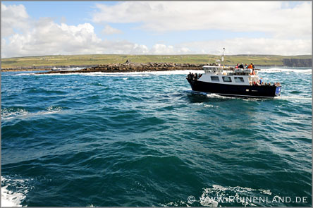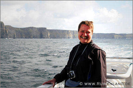 Im Eiltempo fuhren Birgit und ich daraufhin die 12 Km nach Doolin und erwischten um 17.00 Uhr gerade noch das letzte Schiff für diesen Tag, das zum Glück trotz der höheren Wellen fuhr. Es war ein überaus beeindruckendes Erlebnis und absolut traumhaft - wenngleich mein Magen dem eindeutig widersprechen würde! ;-) Immer wieder wurde das kleine Schiff vom Seegang nach oben gerissen, um mit einem heftigem Schlag zurück auf die Wasseroberfläche zu schlagen. Eine Achterbahnfahrt war nichts dagegen und eine Kreuzfahrt werde ich sicherlich nie machen!