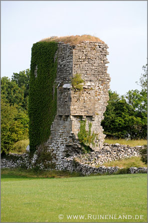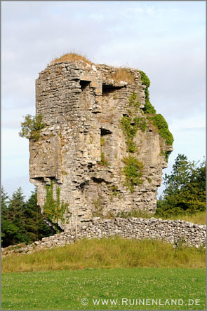 Da die Kirchenruine von Kinlough mit einem Baugerüst umgeben war, beschränkten wir uns dort auf den Besuch der gleichnamigen Burgruine. Wie so oft wurde das umliegende Ackerland als Weidefläche genutzt und war umzäunt. Um nicht zurück zum Gatter laufen zu müssen, kletterte ich kurz entschlossen über den Zaun - mit dem Resultat, dass ich am Stacheldraht hängen blieb, meine Hose zerfetzte und mir schmerzhaft die Innenseite der Oberschenkel aufriss...