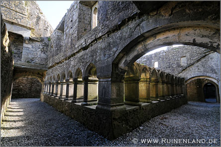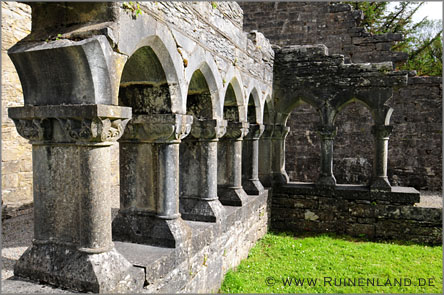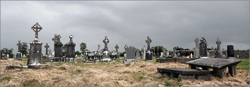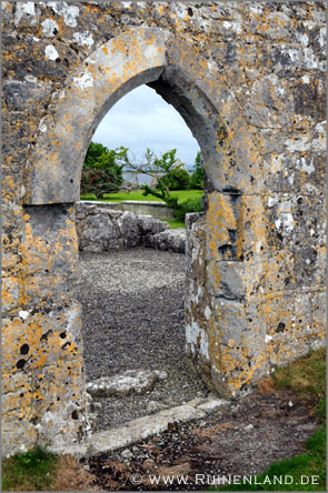 Ich parkte extra etwas von der Ross Errily Friary entfernt, um nicht das Auto auf meinen Fotos zu haben. Als Birgit und ich uns der Ruine näherten, waren wir verwundert darüber, dass schon am frühesten Morgen jemand in den Mauern Musik zu machen schien. Um so erstaunter waren wir, als wir feststellten, dass lediglich der Wind durch die Fenster, Kreuzgänge und Hallen wehte und dabei diese zauberhaft anmutenden Melodie wie von Harfen und Klangschalen erzeugte. Unbeschreiblich schön; man muss dieses Klangspiel selbst erlebt und gehört haben, um es glauben und nachempfinden zu können. Wir hielten uns gut zwei Stunden in den alten Mauern auf und just als wir diese verließen, bog ein voll besetzter Touri-Bus um die Ecke. Wie gut, dass wir am Morgen so früh vom Guesthouse losgefahren sind, denn die Menschenmasse aus dem Bus zerstörte die friedliche Atmosphäre der Klosterruine doch merklich.