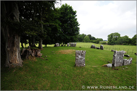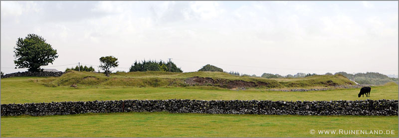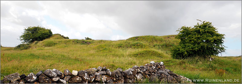 Wir fuhren weiter Richtung Norden. In der dortigen Gegend existieren in einem Umkreis von 10 Km gleich ganze 20 frühgeschichtliche Ringforts, von denen ich wenigsten ein paar besuchen wollte. Birgit fand diese "Ansammlung runder Erdhaufen" indes wenig spannend und blieb während meiner Erkundungen im Auto. Das erste Ringfort von Mirehill ist gleichzeitig das größte und am besten erhaltene. Der Graben zwischen dem äußeren Wall, auf dem einst schützende Holzpalisaden standen, und der inneren Motte (Burghügel aus Erde) war noch gut zu erkennen. Fast oben angekommen, sprang jedoch ein Pferd hinter den Büschen hervor, so dass ich meine Beine in die Hand nahm und schleunigst wieder hinter dem Zaun verschwand. Von drei weiteren Ringforts machte ich daraufhin lediglich Fernaufnahmen.