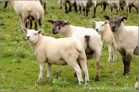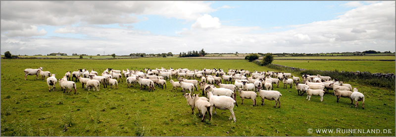 Nach der kurzen Besichtigung der alten Mühle und der kleinen Kirchenruine von Shrule deckten wir uns in einem Dorfladen mit kalten Getränken ein und fuhren anschließend weiter zum Killernan Castle, einst bewohnt von George Blake. Da vor der Ruine mehrere Kühe grasten, verzichtete ich darauf, näher heran zu gehen. Birgit erfreute sich zwischenzeitlich an den vielen Schafen auf der benachbarten Weide.