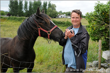 Ein letzter Stopp in Ballinrobe galt dem alten Friedhof, welcher der Bezeichnung "Gottesacker" jede Ehre machte. Die hinter dem Friedhof stehende Kirchenruine war jedoch nicht zugänglich und die umliegende Wiese wurde als Pferdekoppel genutzt. Während Birgit in meine Kamera lächelte, ließ sich das Pferd als Dank für Streicheleinheiten ihre Jacke schmecken. :-D