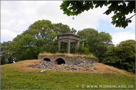 Erneut Mauern überkletternd gingen wir anschließend zu dem "unvollendeten Tempel", der mit seinem Aufbau aus sechs Säulen an den Baustil der "Dorischen Ordnung" angelehnt war. Erbaut wurde er vor 1865 von John Browne, Baron of Kilmaine, zu Ehren seines ersten Titels als "Lord Mount Temple". Genutzt wurde der "Tempel", in dessen Sockel sich ein Gewölbe mit vier steinernen Stützpfeilern befindet, jedoch nicht für religiöse Zwecke, sondern das Monument wurde von den Damen der angrenzenden Hofgüter als Treffpunkt zum Plaudern und Relaxen auserkoren. Mmh, recht banal also; ein etwas "mystischerer" Hintergrund hätte mir besser gefallen.