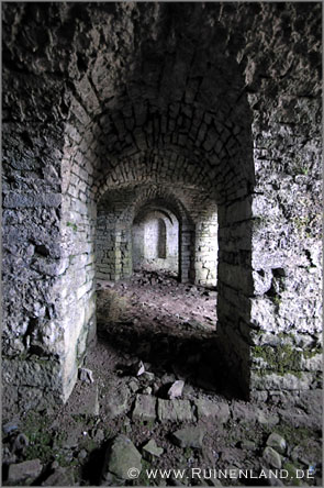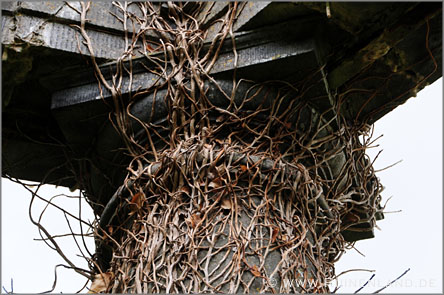 Vom Brunnen aus überstiegen Birgit und ich zwei brüchige Mauern und schreckten dabei einen Hasen auf. Ich wollte gerade eine kleine Kuppe zur Mühle hinaufsteigen, als sich mir dahinter eine riesige Kuhherde mit mehreren Bullen entgegen stellte. Ganz toll, wo mir diese Tiere aus der Nähe eh nicht ganz geheuer sind. Um die Mühle überhaupt sehen zu können, mussten wir uns deshalb auf "gut gedüngtem" Waldboden durch die Büsche schlagen. Machte die einstige Mühle von außen noch einen halbwegs stabilen Eindruck, hatten wir im Inneren hingegen eher das Gefühl, dass die Mauern gleich über uns zusammenbrechen würden. Als in diesem Moment auch noch Wind und Regen einsetzten, verließen wir das Gebäude deshalb lieber zügig.