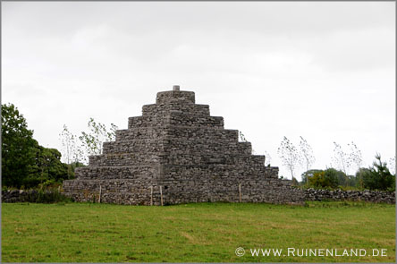 Auf den nächsten Ort, Neale, war ich besonders gespannt. Bei meinen Recherchen entdeckte ich dort gleich mehrere interessante Bauten: einen alten Brunnen, eine Tempelruine, die Ruinen einer Mühle, eine Kirchenruine und zuletzt (womit man in Irland wohl kaum rechnet) eine Pyramide. Wir parkten auf einem Feldweg neben dem Brunnen. Während Birgit ein Pferd streichelte, ging ich die vier flachen Stufen zum Wasserloch hinunter, um von dort eine Flasche zu entfernen, die mich für das Foto störte. Lange hielt ich meine Hand jedoch nicht ins Wasser, denn wie ich mit einem Schrecken feststellte, lebten darin Blutegel, von denen auch einer an der Flasche hing (selbige flog sogleich in einem hohen Bogen auf die Wiese...). Hätte eines dieser Dinger anschließend an meiner Hand gehangen, hätte ich hyperventiliert. ;-)