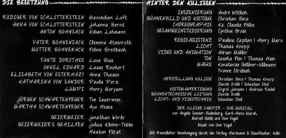 Schon nach kurzer Zeit fielen die aufwendig gestalteten Kostüme mit viel Liebe zum Detail auf (zum Beispiel waren auf Rüdiger Hemd in rot seine Initialen "RvS" gestickt). Die kompletten Vampirkostüme wirkten so, als seien sie wirklich aus der Zeit, in der die Menschen, bevor sie zu Vampiren wurden, mal gelebt haben. In anderen Kindermusicals, die ich vom kleinen Vampir bisher gesehen habe, hatten die Vampire teilweise moderne Turnschuhe an - nach solchen "Fehlern" suchte man hier jedoch vergebens - wirklich toll!!