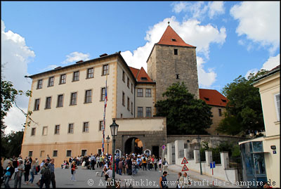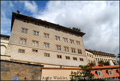 Hinter einer Glasscheibe einer Seitenkapelle des St. Georgs Klosters waren die Gebeine "einer Frau aus dem Konvent" zu sehen, während durch einen Schacht das Licht auf die darüber liegende, kunstvoll bemalte Deckenkuppel fiel. Im Königspalast besichtigte ich u.a. den großen Wladislaw-Saal, die Reiterstiege und die alte Landrechtsstube mit dem Königsthron, bevor ich nach fast drei Stunden die Burg vorbei am Pulverturm wieder verließ.