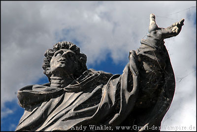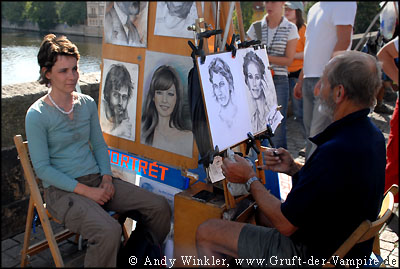 Vom Burgberg lief ich am Flussufer der Moldau (Vltava) entlang bis zur Karlsbrücke, auch hier herrschte hektisches Treiben. Händler boten ihre Waren den Touristen feil, Straßenmusiker spielten auf ihren Instrumenten und Zeichner fertigten Portraits und Karikaturen. Auf beiden Seiten der 520 m langen Brücke standen insgesamt 30 Statuen von Heiligen, deren Gesichter zum Teil von Spinnweben umgeben waren. Es handelt sich hierbei jedoch lediglich um Kopien, die Originale werden aus Schutz vor Umwelteinflüssen im Museum aufbewahrt. Im Jahr 1393 nahm Johannes von Nepomuk, Erzbischof von Prag, der Ehefrau von Kaiser Wenzel (Waclav) IV die Beichte ab. Als sich Nepomuk anschließend weigerte, sein Beichtgeheimnis dem Kaiser zu verraten, befahl dieser, den Erzbischof von der Karlsbrücke in die Moldau und somit in den Märtyrertod zu werfen. Nepomuks Geist wurde daraufhin über 300 Jahre immer wieder am Moldauufer und auf der Brücke gesichtet. Die Statue des hingerichteten Erzbischofs aus dem Jahre 1683 ist gleichzeitig die älteste. Über sie wird erzählt, dass darin Nepomuks Geist gefangen war, bis zu jenem Tag, als die Statue gegen eine Kopie ausgetauscht wurde.