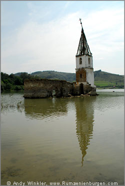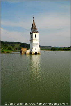 Vorbei an der einstigen Wehrkirche von Hetiur (Marienburg) bogen wir Richtung Osten ab. Über Fantanele, wo mal wieder die Türme eines stillgelegten Kraftwerks das Dorf überragten, fuhren wir durch Sangeorgiu de Padure zum Lacul Benic. Kurz hinter Sangeorgiu ging die geteerte Straße in einen mehr oder weniger gut befahrbaren unbefestigten Weg über, welcher den See umrundete. Nachdem die Straße auf dessen Rückseite aufgrund tiefer Löcher und Schlamm nicht mehr befahrbar war, parkte ich das Auto und wir liefen den letzten Kilometer zur Kirchenruine zu Fuß. Wann die Kirche erbaut und schließlich (vermutlich durch Stauung des Sees) zerstört wurde, ist mir nicht bekannt, aber in jedem Fall boten die aus dem Wasser herausragenden Mauern ein schönes Motiv. Ähnlich wie am Lacu Rosu (siehe Reisebericht von 2003) standen auch hier vereinzelt die Stümpfe abgestorbener Bäume im Wasser und an verschiedenen Stellen hatten sich Angler am Ufer niedergelassen. Einer von ihnen sprach mich an und wollte mir scheinbar etwas über die Kirche erzählen, ich verstand jedoch leider außer "Kirche" kein einziges Wort.