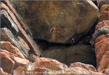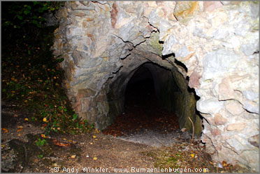 Ich war mittlerweile etwas entnervt und hatte die Burgruine bereits abgeschrieben, was mich doch ärgerte. So gingen wir zurück zur Kapelle und folgten dahinter einem verwitterten Pfad zum Wachturm. Dieser war jedoch selbst gar nicht mehr zu erreichen, nur noch ein paar geringe Mauerreste waren auf einem unzugänglichen Felsen zu sehen. Wir waren bereits auf den Abstieg eingestellt, als uns auf der Rückseite der Kapellenruine ein kaum mehr als solcher erkennbarer Pfad auffiel. Trotz der bereits einbrechenden Dunkelheit (optisch war es bereits dunkler, als auf den Fotos) wollte ich nichts unversucht lassen und so streiften wir über Felsen ein Stück bergab durch die Büsche. Ich wollte schon umdrehen, als ich auf der anderen Seite eines verwitterten Grabens die dunklen Schatten der Burgmauern entdeckte. Ich rief Alex, der oben gewartet hatte, zu "Ich hab' sie gefunden!", um gleich darauf freudig das kurze Stück zur Ruine hinauf zu klettern. Das war eine Burg nach meinem Geschmack - mitten im Wald, schön verwildert und noch mit reichlichen Mauerresten. Torbögen und Fensteröffnungen waren noch gut erkennbar und immer wieder ragten Mauerstücke vom Felsen empor. Im hinteren Teil der Ruine klaffte ein etwa 1,5 Meter breites Loch im Boden und vom oberen Burgfelsen hatte man einen tollen Blick auf den gegenüberliegenden, bewaldeten Berg. Vor dem inneren Tor auf der Rückseite zweigte eine kleine Höhle in den Fels ab. Ich packte meine Taschenlampe aus und kroch hinein, als mir eine Fledermaus entgegen flatterte. Ich hatte noch nie so viele Fledermäuse in so wenigen Tagen gesehen und es sollte auch nicht die Letzte sein. Im Inneren der niedrigen Höhle war am bearbeiteten Stein zu sehen, dass sie einst in die Burg integriert gewesen sein musste, offensichtlich ist der Fels an dieser Stelle aber irgendwann abgesackt oder in Teilen eingestürzt.