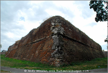 Aufgrund des starken Regens am Mittag hatte ich die zum Schluss eingeplante, etwas abgelegene Burgruine bei Sub Cetate aus dem Programm gestrichen und fuhr stattdessen noch zur Festung in Oradea (Großwardein). Aufgrund mehrspuriger Hauptverkehrs-Einbahnstraßen und Baustellen fand ich die Zufahrtsstraße nicht. Ich fuhr deshalb zum verschlossenen Osttor auf der Rückseite und ging mit Alex von dort um die Festungsmauern herum zum Eingangsportal auf der Westseite. Eine mehr oder weniger typische Festung mit sternförmigem Grundriss und starken Eckbastionen, erinnerte die Anlage, in der u. a. die Kunstakademie der Universität untergebracht ist, zum Teil eher an eine Fabrikruine. Ein Großteil der mehrstöckigen Gebäude stand leer, dunkle Fenster reihten sich an den im Inneren ruinösen Ziegelbauten aneinander. Jetzt wunderte es mich auch nicht mehr, dass im Internet fast ausschließlich immer nur die gleichen Ansichten von Kirche und der äußeren Bastionen zu sehen sind.