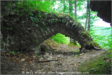 Unsere letzte Burgruine für diesen Tag lag nahe Alesd, genauer gesagt bei Pestis. Durch Zufall hatte ich sie vor geraumer Zeit im Internet entdeckt und wusste von dort, dass sich auf dem Berg nur wenige hundert Meter von einander entfernt gleich drei Ruinen befinden: Eine Burg (Cetatea Sinteului), eine Kapelle und ein Wachturm. In Pestis fragte ich einen älteren Mann nach dem richtigen Weg, dem ich schließlich etwa 5 Km in den Wald folgte. Dass er aufgrund des Regens aufgeweicht, aber auch im trockenen Zustand nur schwer befahrbar wäre, brauche ich wohl kaum zu erwähnen. Nichts desto trotz wäre ich die 10 Km auch bei früherer Tageszeit sicherlich nicht gelaufen und fuhr deshalb ungeachtet der Straßenverhältnisse einfach weiter, bis der Weg an einer Schranke endete. Ich stellte den Wagen davor am Seitenrand ab und wir gingen zu Fuß weiter. Bereits nach wenigen Metern hatte sich so viel Schlamm an meinen Füßen gesammelt, dass jeder Schritt doppelt so schwer wurde, aber zumindest war gleich rechts hinter der Schranke der Burgberg. Der Weg war im Grunde nicht weit und bei trockenem Wetter wäre er sicherlich auch gut zu laufen gewesen; an diesem Tag versank ich jedoch regelrecht im Matsch und rutschte trotz Stock, den ich mir gesucht hatte, immer wieder nach unten weg. Nach etwa 20 - 30 Minuten kamen wir auf halber Höhe an und vor uns stand romantisch verwachsen die Kapellenruine mitten im Wald. Ob sie einst zur Burg gehörte, ist mir nicht bekannt, hierfür muss ich mir erst die mir vorliegenden ungarischen Texte übersetzen lassen.