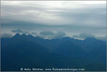 Bei der Ruine der Abtei von Carta (Kerz) legten wir einen kurzen Fotostopp ein und fuhren anschließend quer durch die Mitte Siebenbürgens. Am Horizont war die Kulisse der im Nebel liegenden Karpatenberge zu sehen, am Wegesrand standen einsam auf einem Hügel drei Kreuze.