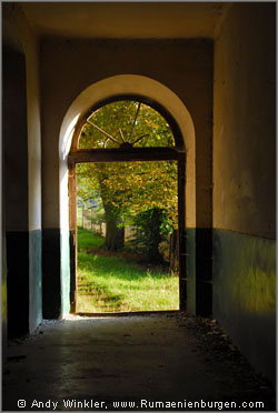 In Merghindeal (Mergeln) stand vor der Kirchenburg das leer stehende, ehemalige Schulgebäude. Fenster waren zerbrochen und die Decken waren rissig. Ich trat ins Innere und durchstreifte die Räume, als aus einer dunklen Ecke ein drohendes Knurren zu vernehmen war. Offensichtlich hatte sich ein Straßenhund das ruinöse Gebäude als Behausung auserkoren und so zog ich es vor, es schnell wieder zu verlassen.