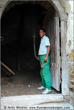 Zum Schluss machten wir einen Abstecher nach Felmer (Felmern), wo sich laut Sara die Ruine einer Kirchenburg befand, welche nicht in meiner Karte eingezeichnet war. Dort angekommen war das Tor verschlossen und ich ging um sie herum, um von allen Seiten Fotos machen zu können. Ich befand mich gerade auf der Rückseite, als die Glocken im Turm geläutet wurden. Schnell lief ich nach vorne und ging durch die inzwischen geöffnete Tür. Der Junge, welche die Glocken läutete und sich auf meine Nachfrage gerne fotografieren ließ, holte daraufhin einen deutsch sprechenden Mann. In einem überaus schroffen Ton fragte er mich "Was sucht ihr hier?" Ich erzählte ihm kurz von meinem Interesse an rumänischen Burgen und fragte ihn freundlich, ob es möglich sei, auch die Kirche von innen zu besichtigen. Gleich bleibend unfreundlich und abweisend erwiderte er nur "Das geht nicht!", woraufhin wir Felmer wieder verließen.