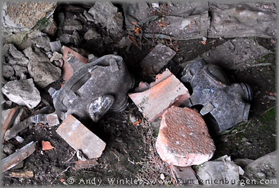 Wir wollten gerade fahren, als wir den Eingang zu einem Gewölbekeller entdeckten. Während alle anderen im Auto blieben, stieg ich noch mal aus, um mir diesen näher anzuschauen. Weit kam ich allerdings nicht. Am Eingang lagen mehrere Atemschutzmasken auf dem Boden und aus dem Keller drang ein derart beißender Geruch, dass ich nur mit vorgehaltener Hand ein paar Meter hinein gehen konnte, um überhaupt ein Foto zu schießen. Ob es hier irgendwann einen Chemieunfall gab oder man den Keller lediglich zur (illegalen?) Lagerung von Giftmüll nutzte, kann ich nicht beurteilen, jedenfalls hatte ich anschließend noch gut eine halbe Stunde lang einen chemisch-salzigen Geschmack im Mund. Wahrscheinlich habe ich mit diesem Kellerbesuch mein Krebsrisiko mal wieder um ein paar Prozent nach oben getrieben...