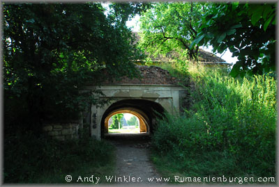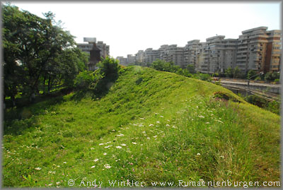 Der Mietwagenverleiher nahm uns ein Stück mit, so dass Albert und ich uns zumindest die 1,5 Km Fußweg zur einstigen Festung von Cluj-Manastur (Klausenburg-Appesdorf) gespart hatten. Dort gab es außer Erdwällen und einem kleinen Mauerstück aber kaum noch etwas zu sehen, so dass wir uns nicht lange an der Befestigung aufhielten und per Taxi weiter in die Stadt fuhren, wo als nächstes die Festung auf unserem Programm stand. Flächenmäßig zwar bedeutend größer, gab es aber auch hier außer dem Torhaus lediglich noch Erdwälle zu sehen.