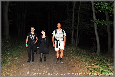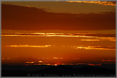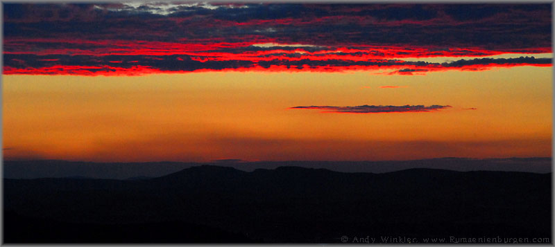 Wir gingen erneut zurück zum Auto und fuhren nun zum mittlerweile dritten Berg, von dem uns gesagt wurde, dass sich dort die Ruine befände. So weit, so gut, im Wald jedoch ein gewohntes Bild: Ein Weg führte nach links, einer nach rechts und ein dritter geradeaus. Jetzt war guter Rat teuer. Wir entschieden uns für links - bei meinem Glück mit Sicherheit die steilste Aufstiegsmöglichkeit. Oben angekommen von der Burg jedoch weit und breit keine Spur, stattdessen zwei weitere Wege. Und inzwischen wurde es auch bereits langsam dunkel. Wieder folgten wir dem Weg nach links, aber auch dieser führte nicht zur "Cetatea Fetei", sondern auf ein weitläufiges Wiesenplateau. Ich gab auf. Inzwischen war es für die weitere Suche ohnehin zu spät, stattdessen genoss ich von hier oben den Sonnenuntergang, bevor wir uns in der Dunkelheit den Weg zurück zum Auto suchten. Übrigens: Wie ich wieder zuhause im Internet feststellen musste, sind wir gerade mal etwa 300 Meter an der Ruine vorbei gelaufen; sie lag nicht links, sondern rechts. Nun ja; bei meinem nächsten Besuch in Cluj weiß ich jetzt zumindest, wo sich die Burg befindet und muss nicht mehr suchen.