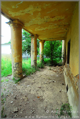 In Geaca (Jeckel) suchten wir nach dem Schloss Beldy, jedoch erst auf Nachfrage, bei der man und mitteilte, dass dieses Jahr das Dach eingestürzt sei, fanden wir es. Gegenüber lag eine Schule und zwischen dieser und dem Schloss stand ein Zaun mit verschlossenem Tor. Als uns ein Regenschauer überraschte und wir uns unter einem Baum unterstellten, sah ich hinter dem Schloss einen Mann entlanglaufen. Also musste es dort auch einen Weg geben. Kaum hatte der Regen aufgehört, konnten Albert und ich so also doch noch einen Blick ins Innere werfen. Attila wartete zwischenzeitlich im Auto, während Miri Maulbeeren sammelte.
