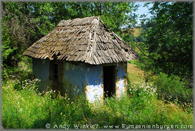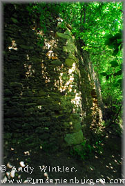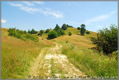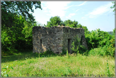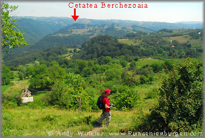 Drei mögliche Wege standen uns zur Verfügung - und natürlich erwies sich erst der dritte Versuch als erfolgreich. Vom südlich gelegenen Dorf Buteasa gab es entgegen einer Karte keinen befahrbaren Weg, so dass ich zwei Männer fragte, welche uns auf eine Schotterstraße durch den Wald schickten. Diese endete am Fluss zwar unweit des Burgberges, dieser hatte auf der Flussseite jedoch eine steile Felswand und keinen begehbaren Weg. Auf nochmalige Nachfrage bei einer Feriensiedlung am Fluss teilte man uns mit, dass wir die unbefestigte Straße zurück durch den Wald nehmen und weitläufig um den Burgberg herum nach Berchezoaia fahren müssten. Dort angekommen, fand sich sogar ein Wegweiser zur Ruine, für Rumänien eher eine Ausnahme. Hinter dem Dorf teilte sich die Schotterstraße, ein weiteres Schild oder gar Wanderzeichen gab es jedoch nicht. Ich parkte und wir stiegen auf den benachbarten Berg hinauf. Dort erklärte uns ein Bauer, wo sich die Ruine tatsächlich befindet (siehe Foto oben rechts). Meine Begeisterung hielt sich bei der Entfernung verständlicher Weise in Grenzen, zumal die Sonne brannte und das Thermometer stolze 37°C anzeigte. Nach einem endlosen Fußweg in sengender Hitze durch zwei Täler und über einen weiteren Hügel hatten wir es aber schließlich geschafft und nach dem Durchstreifen einer hüfthohen Wiese endlich die Ruine der einst mächtigen Schutzburg aus dem 13. Jahrhundert gefunden.