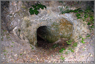 Wir wollten bereits aufgeben, als ich beim Abstieg einen weiteren Weg entdeckte - eben jenen nicht befahrbaren "Fahrweg" auf den Burgberg. Es wurde zwar bereits merklich dunkler, aber wir wollten nichts unversucht lassen, und stiegen auch diesen (zum Glück) noch hinauf. Viel war von der einstigen Burg nicht mehr zu sehen, außer Trampelpfaden, Erdwällen und minimalen Mauerresten lediglich noch eine verschüttete Felsenkammer. Aber Albert und ich waren dennoch zufrieden, die Ruine letztendlich doch noch gefunden zu haben.